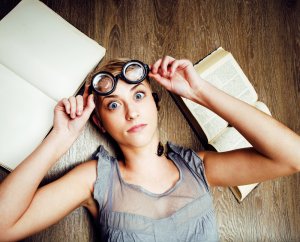 portrait of crazy student girl in glasses with books and cockroaches, concept of modern education people, lifestyle portrait in interior