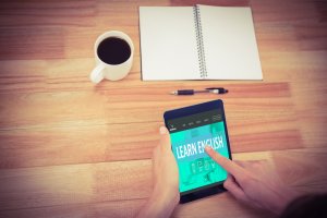 Learn english interface against hipster using digital tablet with book and coffee on table