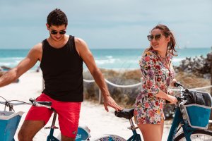 A,Young,Couple,Cycling,On,A,Sunny,Day,In,Miami